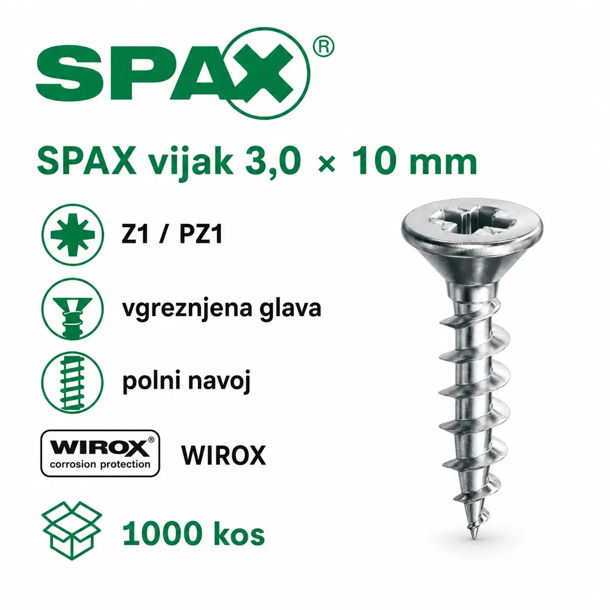SPAX vijak 3,0× 10 mm Z1 je kakovosten nemški pritrdilni vijak, namenjen montaži komponent za žaluzije in senčila, kot so kocke, nosilci, gumbe, pritrdilci palice senčila ter drugo fino pohištveno in senčilno okovje.